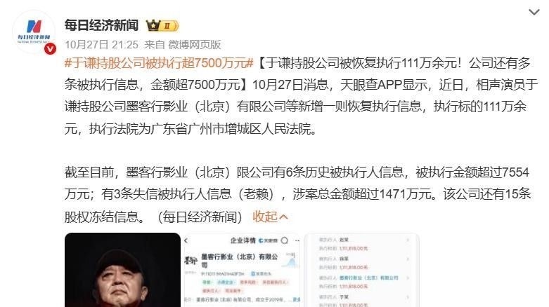 10月27日,广州法院发布一则执行信息,迅速引爆社交平台:于谦新增一笔111万元的恢复执行记录。消息一出,舆论哗然。